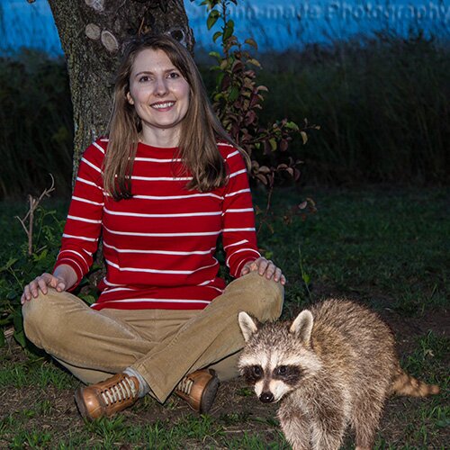 Kathryn Mann with fearless 10-week old raccoon