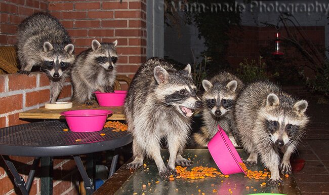 Raccoons have a vocabulary of up to twenty sounds and each of those is varied into different pitches that make their conversations seem almost like songs. Two of “my” current raccoons seem to understand almost everything I say. They have exceptional hearing and can hear sounds too faint or high-pitched for humans to hear. They love music and their tastes seem to be more sophisticated than most people I know. They prefer listening to classical music over rock or country, and especially like the music of Bach and Beethoven. A particular favorite piece is reported to be Beethoven’s 9th Symphony. Raccoons also have a keen sense of smell and will not eat old or decayed food.